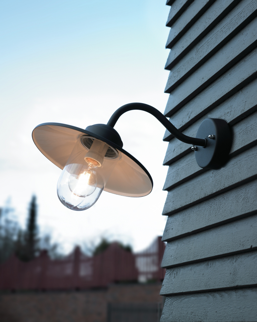 Deze degelijke buitenlamp Karlstad Selva wandlamp is 32 cm breed en geeft licht aan de onderzijde. De lamp is gemaakt van aluminium wat daarna voorzien is van poedercoating in de kleur zwart ral 9005 mat. De onderzijde van de schotel is wit. De Karlstad Selva zwart is buitenlamp van gegoten aluminium met een dikke wanddikte, dit maakt deze buitenlamp uitermate stevig, De breedte is 32 cm, de uitsteek is 42 cm. De hoogte is ca 25 cm. De beglazing is gemaakt van echt glas. Alle armaturen zijn voorzien van een E27-fitting voor ledlampen in de sterkte en lichtkleur naar uw keuze. De IP-waarde van deze buitenlamp is IP55.