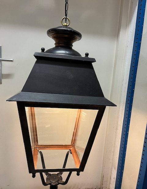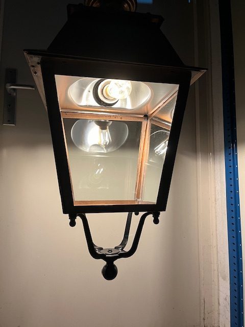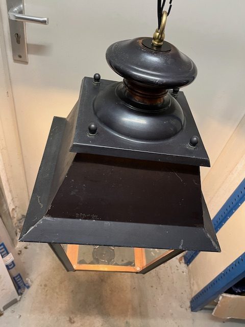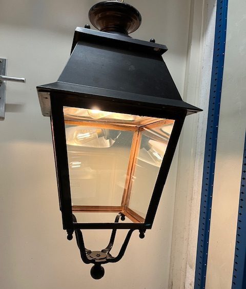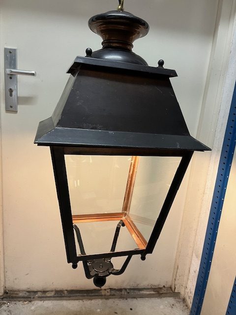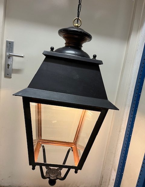 Deze koperen buitenlamp is een oude koperen kap welke door ons geheel opgeknapt is. De basis is een oude koperen kap, reeds voorzien van een mooie oxidatie in een donkerbruine kleur. De metalen delen zijn opnieuw zwart gepoedercoat. De kunststof beglazing is vervangen door echt glas. De fitting is een nieuwe E27 fitting, geschikt voor vele modellen Ledlampen in de sterkte en de lichtkleur van uw wensen. De bedrading is geheel vernieuwd. De koperen kap is ca 80 cm hoog en 38 x 38 cm in het vierkant. De steun van deze koperen buitenlamp kunnen we afwerken naar uw wensen. Een vaste plafondsteun is mogelijk, maar ook een ketting is een optie. Of een wandsteun naar keuze. Bezoek onze showroom of stuur een email voor meer informatie hierover.